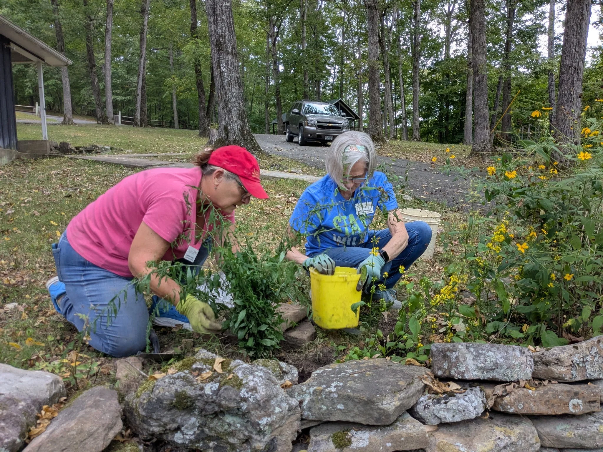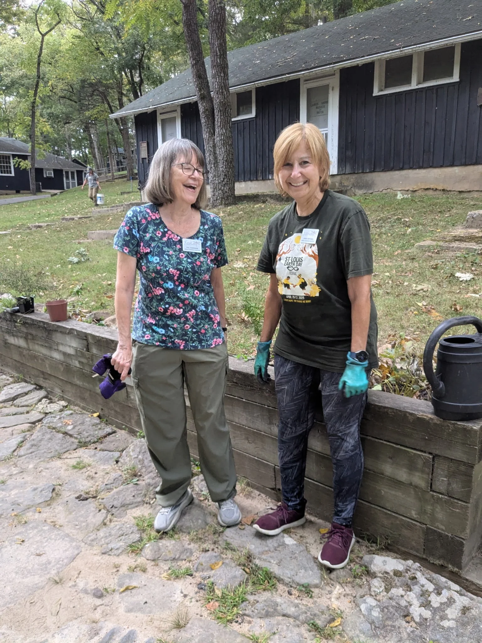Great Rivers chapter members Barb Cerutti, Eileen Kinsella and Sherri Turner organized VS to collect and install native plants in garden beds around the retreat center, with members from all three chapters contributing plants and installing them in the various gardens. Barb and Sherri got the gardens started last year, so this year’s service project involved weeding and refreshing with a few new spots added.